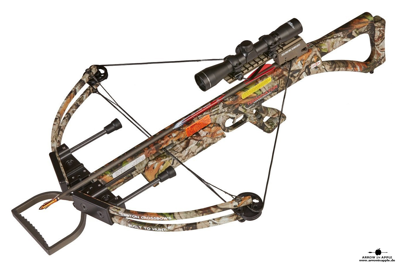 Die Darton Terminator 2 sind eigentlich sehr gewöhnlich aus, ist aber mit einer Geschwindigkeit von 340 fps (25,9g Pfeil), einem sehr leichten und 14" langen Auszug in dieser Preisklasse schon etwas besonders. Sie gibt sich absolut präzise und leise (mit bereits eingebauten Sehnendämpfern). Das mitgelieferte Daed Zone Zielfernrohr mit Geschwindigkeitseinstellung, die Automatische Sicherung und die Trockenschusssicherung machen die Terminator 2 zum Schnäppchen. Ein Triggertech Einbau verringert den Abzugswiderstand auf ca. 0,9kg und erhöht die Treffergenauigkeit mehr als irgendeine Armbrust in der Preisklasse unter 700,-€. Eine einfache Spannhilfe wird empfohlen. Die Darton Terminator 2 ist zusammen mit der Scorpion das Arbeitspferd der Darton Armbrust Familie.