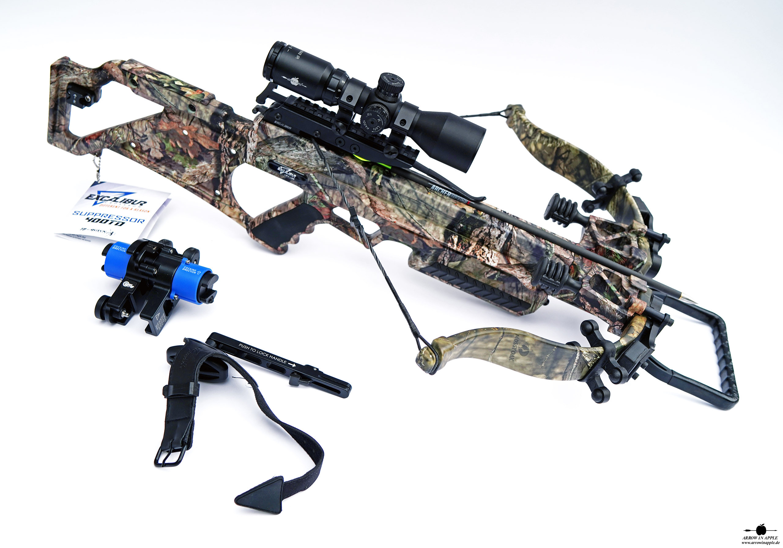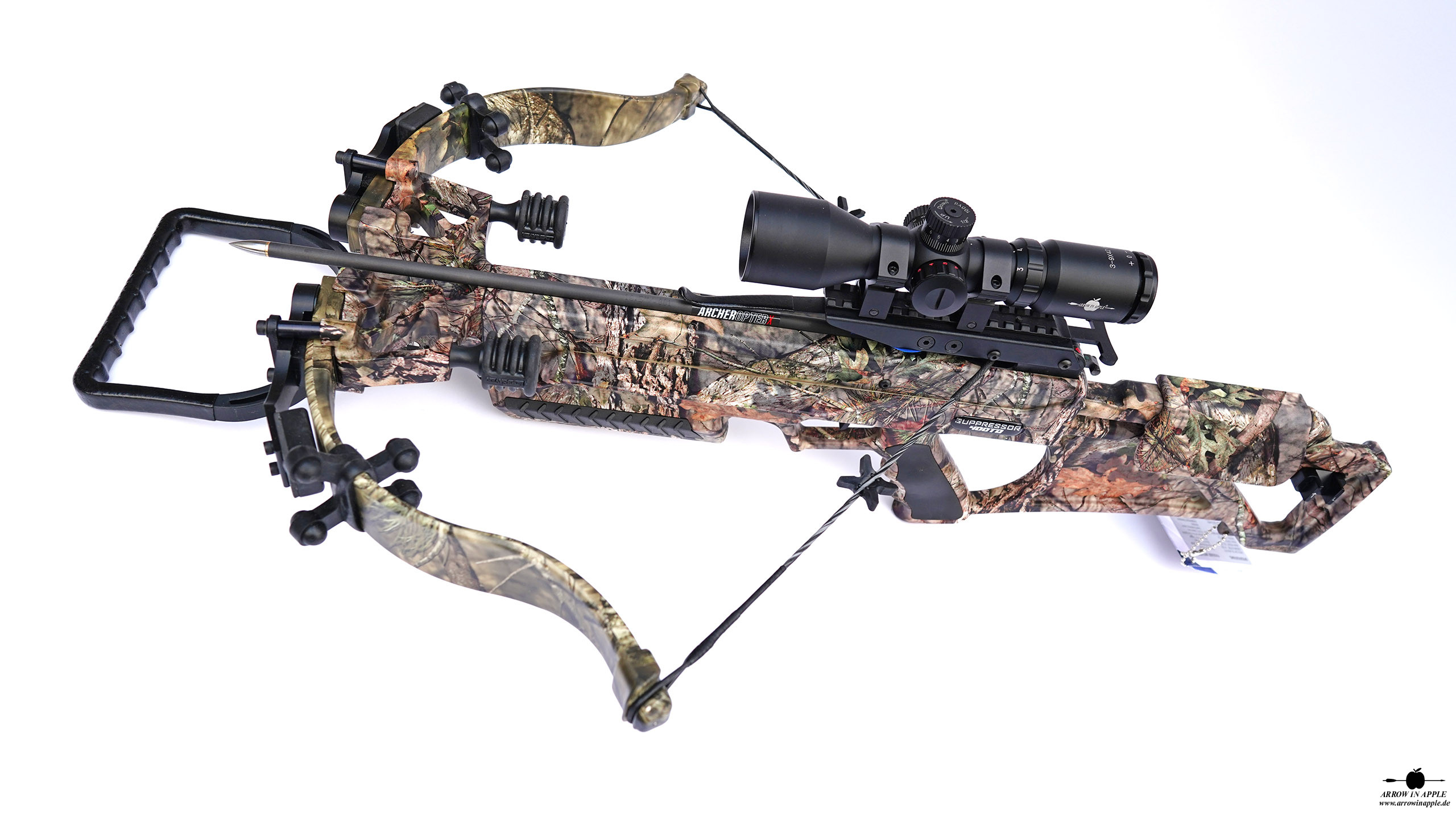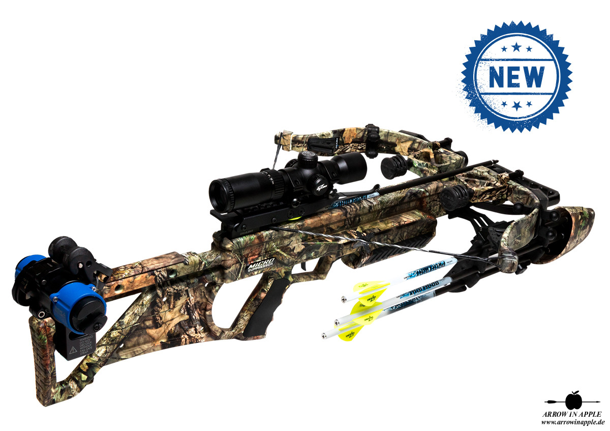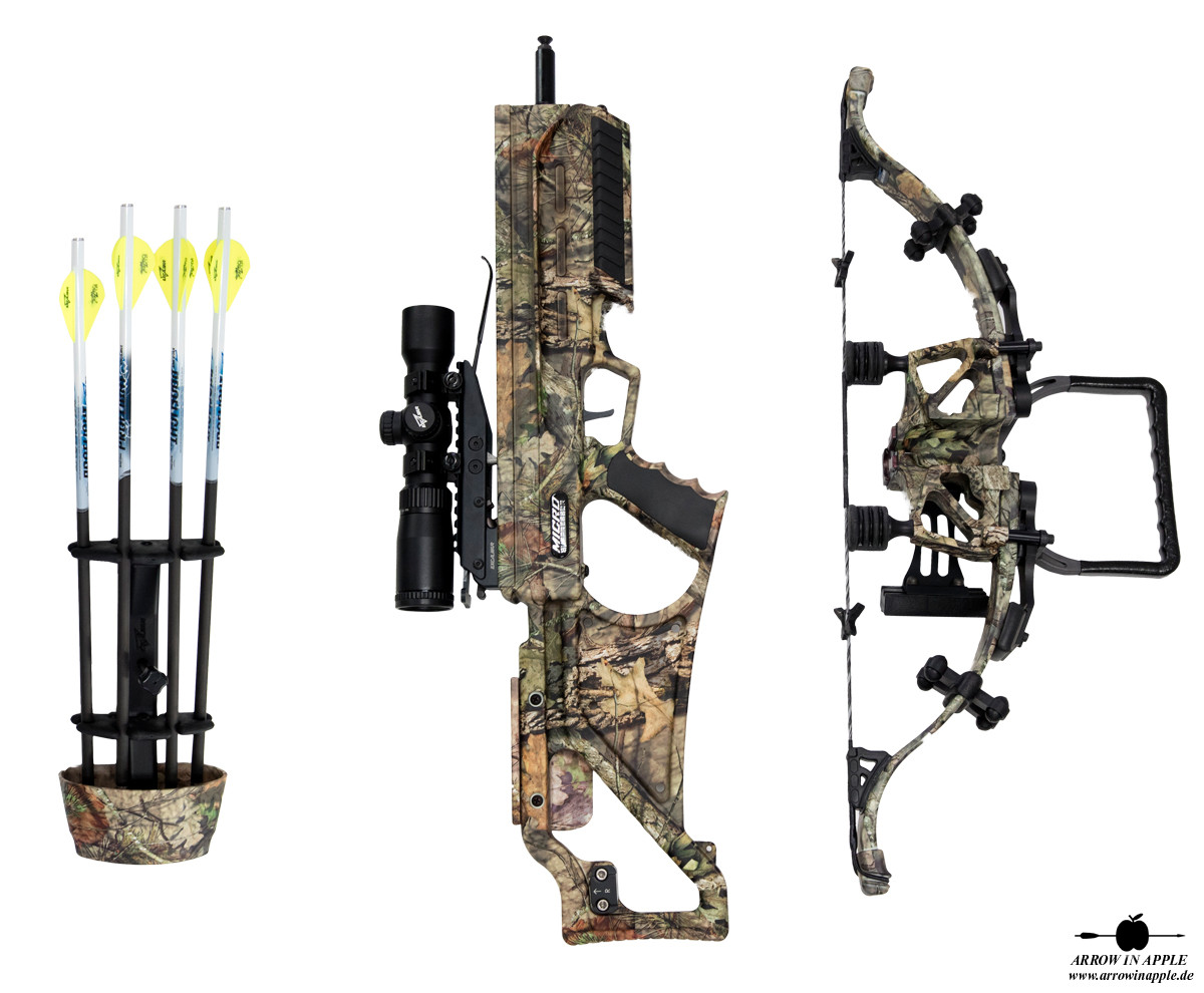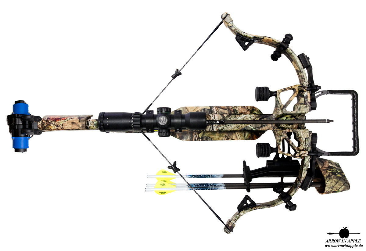Farbgebung komplett in Mossy Oak BUC, Take Down Bogensystem, alle Dämpfungssysteme, ACP Trigger, TactZone 100 Scope als Standard, Charger EXT Kurbelspannhilfe inkl.
