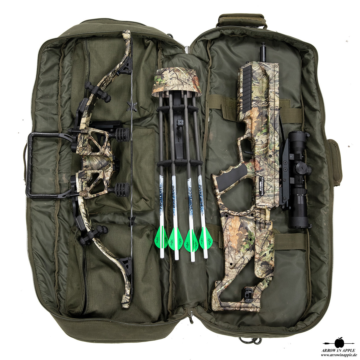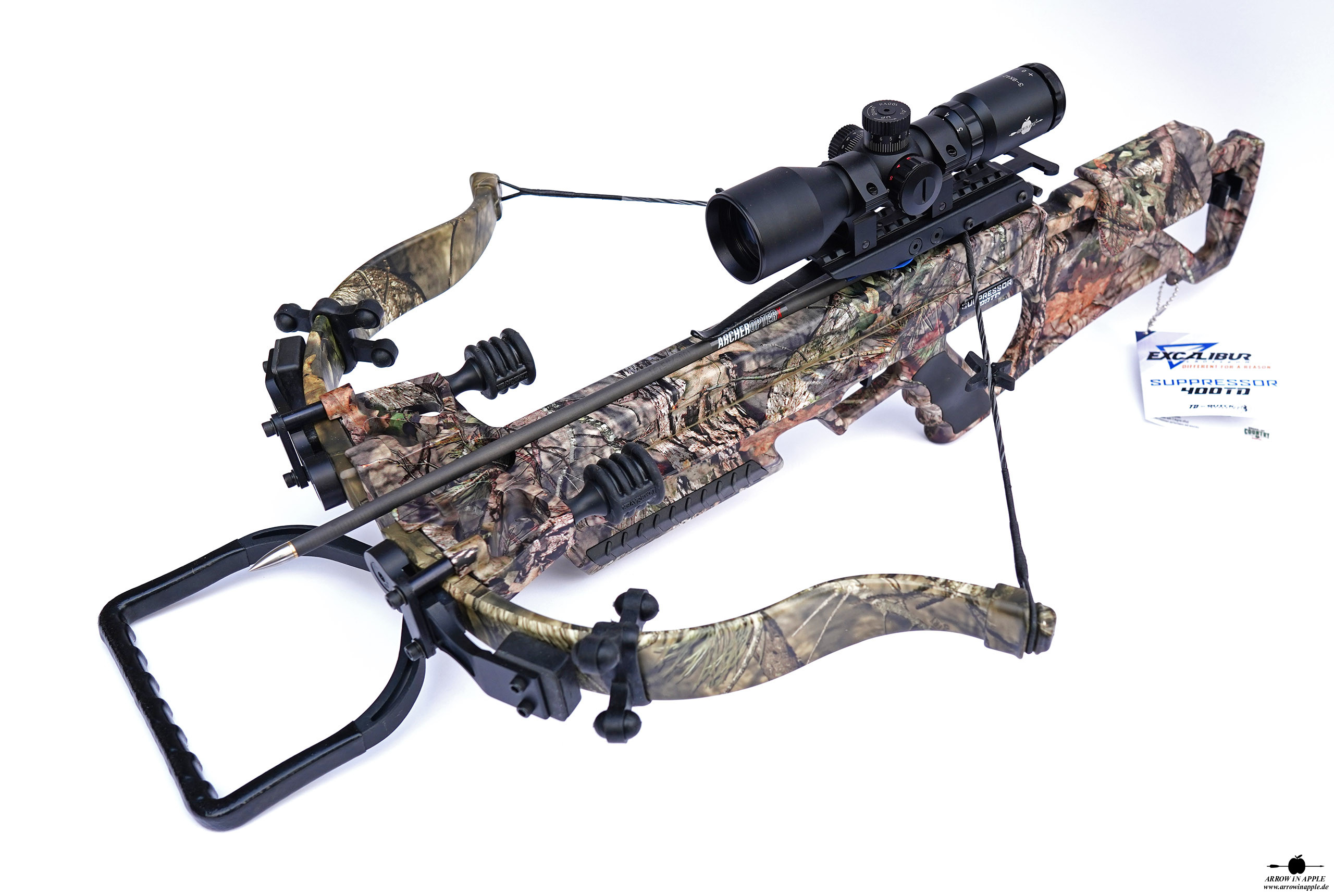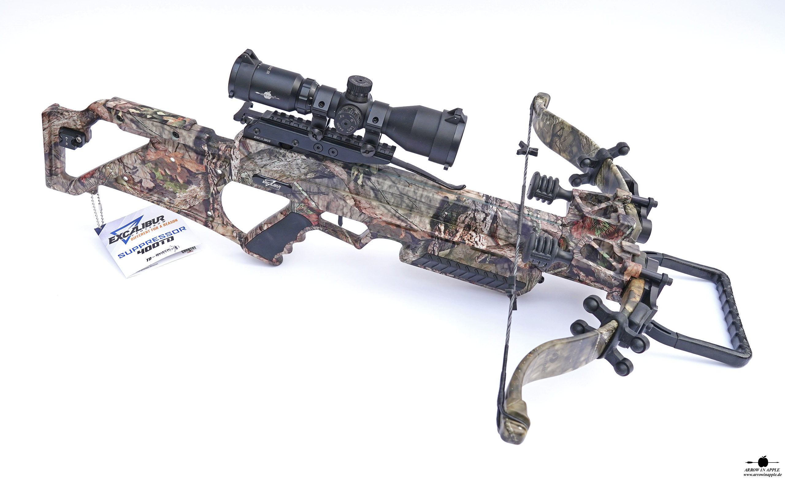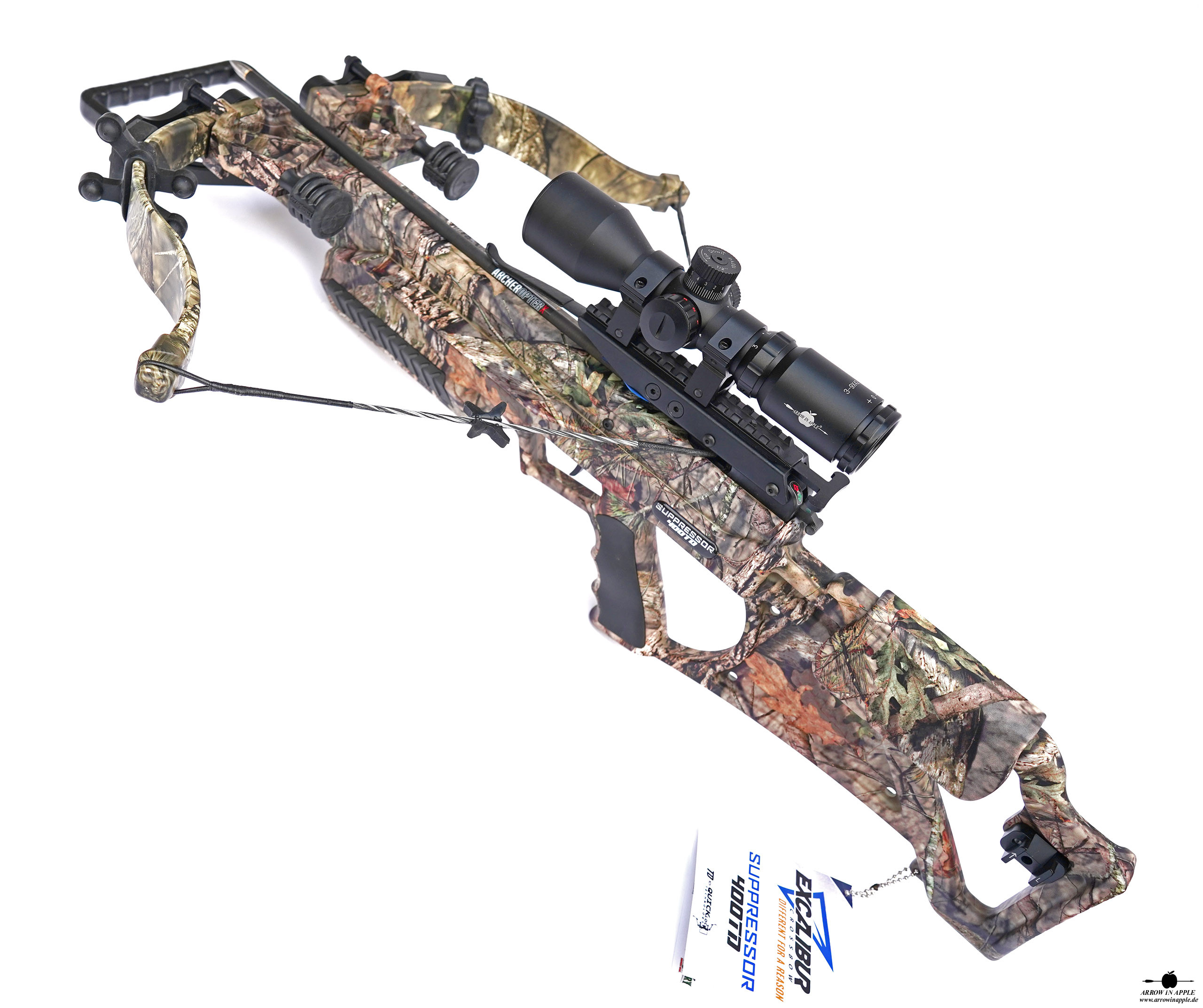 Farbgebung komplett in Mossy Oak BUC, Take Down Bogensystem, alle Dämpfungssysteme, ACP Trigger, TactZone 100 Scope als Standard, Charger EXT Kurbelspannhilfe inkl.