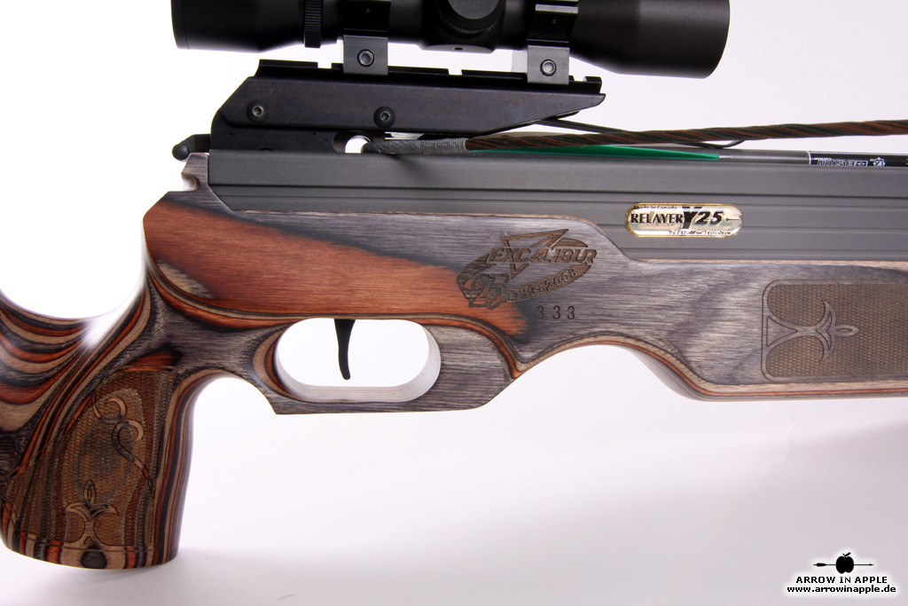 Zum 25 jährigen Jubiläum der Firma Excalibur bieten wir die Relayer 25 als limitierte Ausgabe an. Jede Armbrust ist ein Unikat. Dies wird mit einem Zertifikat der Firma als Urkunde bestätigt. Jede Armbrust ist mit einer in das Holz gravierten Nummer von 1 - 1000 versehen. Der Schaft ist aus 3 verschiedenfarbigen Schichtholzarten gefertigt und mit Lasergravuren versehen bzw. verziert.
