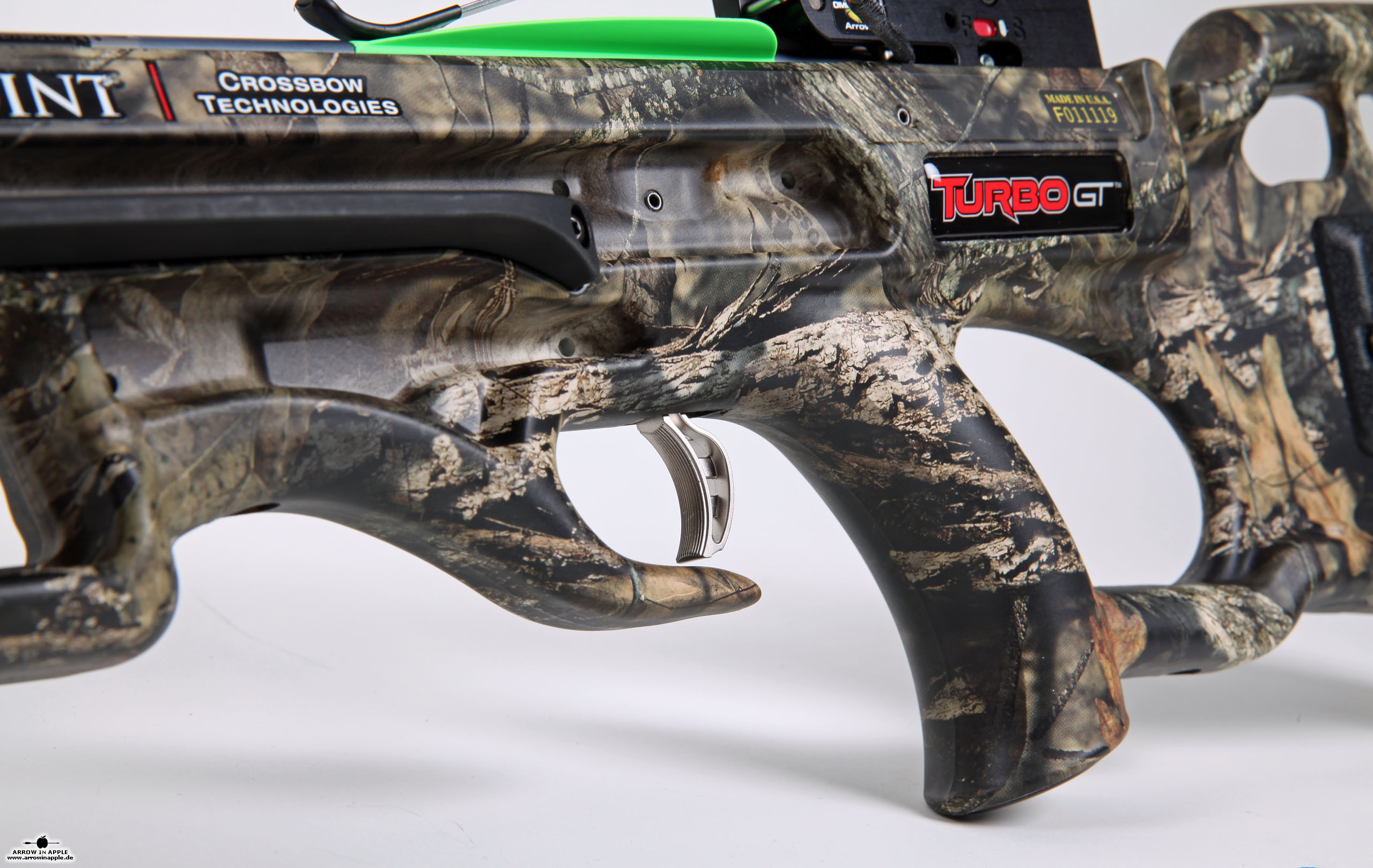 Die Turbo GT 2018 kommt mit den ehemals Stealth FX 4 Wurfarmen der letzten Generation. Deswegen wird sie auch als FX 4" Arbeitspferd" bezeichnet. Und es ist tatsächlich vom Handling, Schussgefühl und der Präzision her eine Stealth. Man merkt einfach die Kraft, die das "kleine" Ding aus den neuen Wurfarmen zieht. Dieses Gerät vereint all das, was man sich derzeit als perfekte, ständig im Gebrauch stehende Sportarmbrust wünscht. Sie ist klein in den Abmaßen, hat eine sehr gute Sehnenlage, leise in Pfeilabgabe (noch besser mit denSDS und BowJax Dämpfungssystemen), absolut präzise im Trefferverhalten und robust durch die neuartige Kunststoffbauweise des Schaftgrundkörpers mit Aluminiumkern. Riser (Bogenmittelteil) Schloss, ZF Schiene, Cams (Compoundrollen) sind aus CNC gefrästen Flugzeugaluminium.