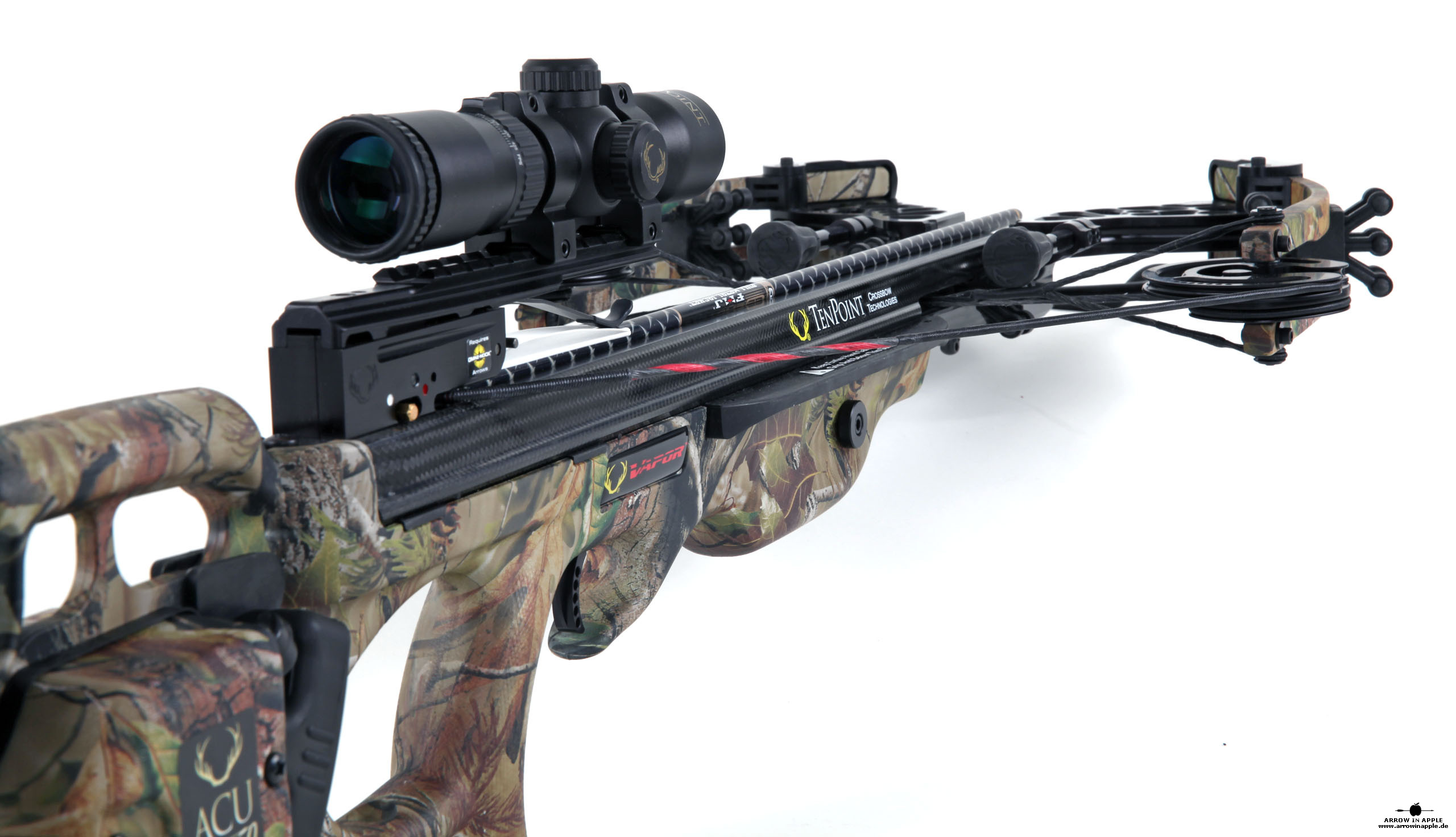 -Europameister 3D- Mit einer TenPoint Vapor wurde 2017 im Attergau / Österreich die Armbrust 3D Europameisterschaft der Männer gewonnen. Die TenPoint Vapor im Komplettpaket ist neben der ehemaligen Phantom CLS, die mit am aufwendigsten hergestellte Armbrust aus dem TenPoint Sortiment. Ebenso wie dier CLS Reihe, ist die Vapor in ihrer Präzision, Funktionalität und Verarbeitung einmalig und zeitlos. Sie besitzt alle 3 wichtigen Sicherungen, die TenPoint entwickelt hat. Die automatische Ladesicherung, die aktive Trockenschusssicherung und die Stützhandsicherung gegen Fingerverletzungen. Der Riser (Bogenmittelteil) ist aus einem 10 Kg Stück Flugzeug Aluminium gefräst und ist so geformt, dass die Wurfarmpaare im gespannten Zusatand fast parallel liegen und damit der Prellschlag so klein wie möglich gehalten wurde. Der Abzug ist leicht und angenehm. Wie ja mittlerweile jeder weiß, sagen Zuggewichte bei modernen Armbrüsten nicht direkt etwas über die Leistung aus. Deshalb sind nur 165 Lbs Zuggewicht bequem zu laden aber sie beschleunigen die Armbrust bei einem 15 Zoll langen Auszug auf über 360 fps mit "normalgewichtigen" 27,3 g Pfeilen. Beim Minimal Pfeil 375 grain sind es sogar 373fps. Diese moderne, schnelle und in ihrer Klasse leichteste Armbrust - die die Firma TenPoint je gebaut hat, ist seit 2013 erfolgreich auf dem Markt.
