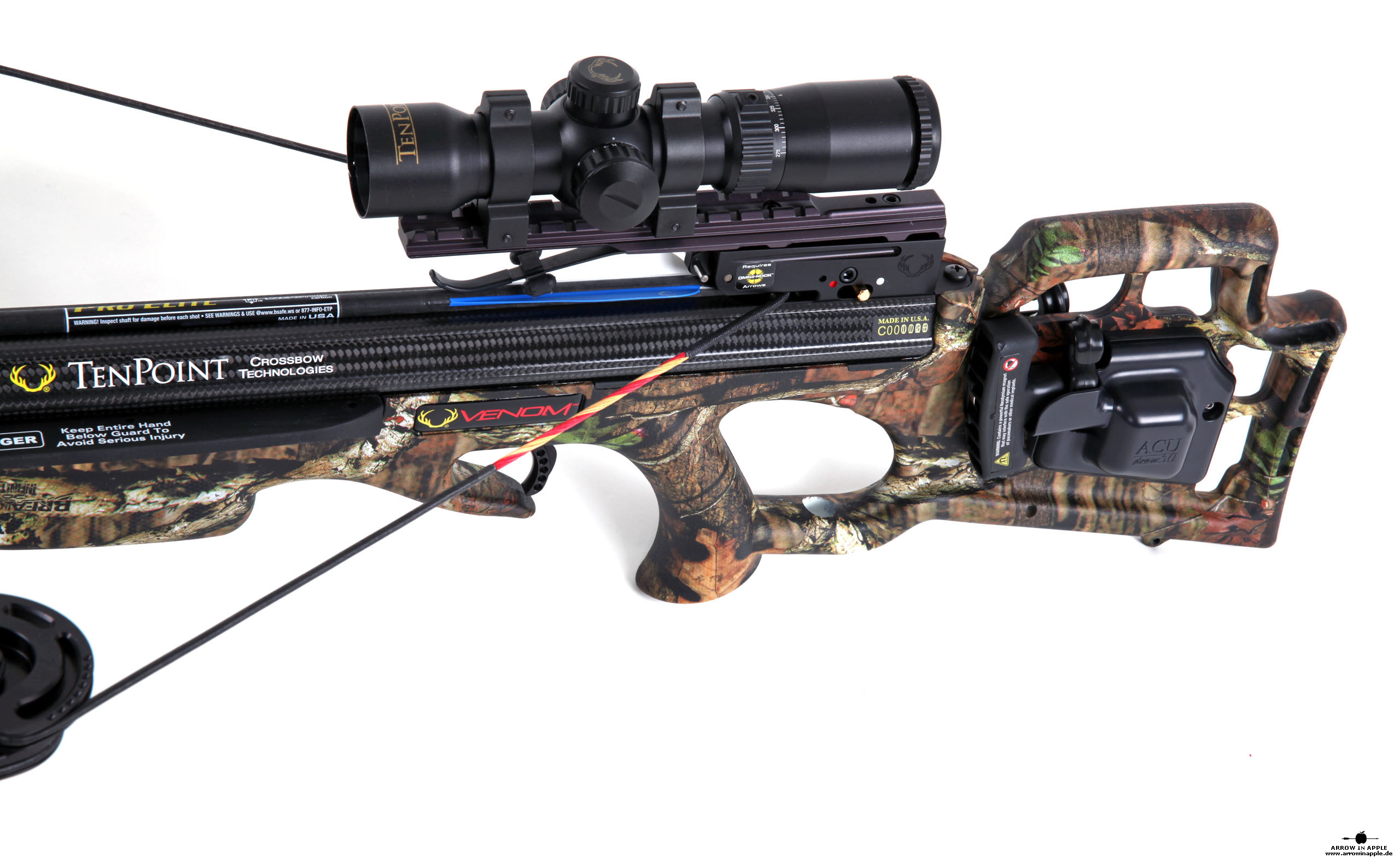 Die TenPoint Venom Kompakt - Armbrust ist in den beschriebenen Abmaßen das schnellste Teil, was die "TenPoint- Schmiede" 2014 herausgebracht hat und sie wiegt dazu noch unter 3kg. Sie besitzt die 2 wichtigen Sicherungen (automatische Abzugssicherung und die patentierte Trockenschusssicherung) und ist serienmäßig mit einem ACU Draw 50 oder wahlweise einem ACU Draw ( Kurbelspannhilfe - für einen Aufpreis ) ausgerüstet. Wir empfehlen zu dieser Armbrust wie zu allen TenPoint Modellen das SDS Sehnen Dämpfungssystem. Das Sehnen- und Kabelsystem ist vom Premiumhersteller Viper X. Außerdem kommt sie ebenfalls serienmäßig mit dem 1,5-5 x 32 Rangemaster Zielfernrohr, welches vom Hersteller bereits eingeschossen geliefert wird. Das Rangemaster deckt alle Entfernungen bis ca. 70m ab. Das von uns empfohlene AIA FRS 101 kann Entfernungen mit der Venom bis 170m bewältigen. Beide Zielfernrohre sind bestens für den 3D Sport oder auch die Jagd gerüstet und darüber hinaus mit dem 101 für das Targetschiessen auf kurze bis Megaentfernungen weit über 100m. |