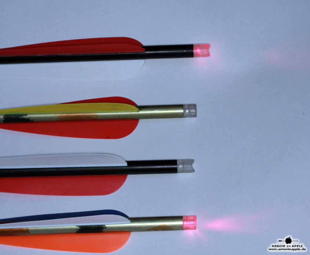Nach der Pfeilabgabe wird der Nock mit Daumen und Zeigefinger leicht nach hinten geschoben, der Kontakt ist unterbrochen und die Leuchtdiode aus. Die Lumenoks sind als Halbmond Nocken uns als Flachnocken für 2219`er Armbrust Aluminiumschäfte ( Pfeile ) verwendbar.