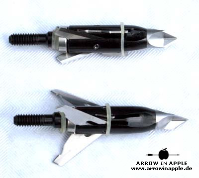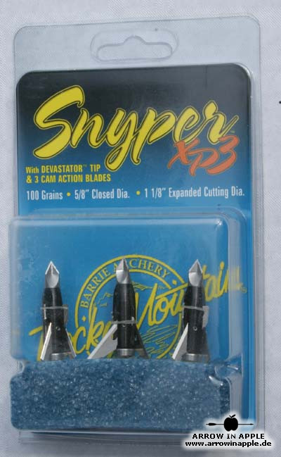 Rocky Mountain Snyper XP3 Jagdspitzen, 3 aufklappbare Klingen, 5/8" geschlossen, 1 1/8" geöffnet und mit 100 gr im Dreierpack. Diese mechanische Jagdspitze hat hervorragende Flugeigenschaften, besonders gut geeignet für Armbrüste mit denen man die hohe Pfeilenergie durch die spezielle Knochenspitze auch nutzen kann. Die 3 Klingen öffnen sich erst nach dem Eindringen, Gewicht 100 grain (ca. 6,48g).