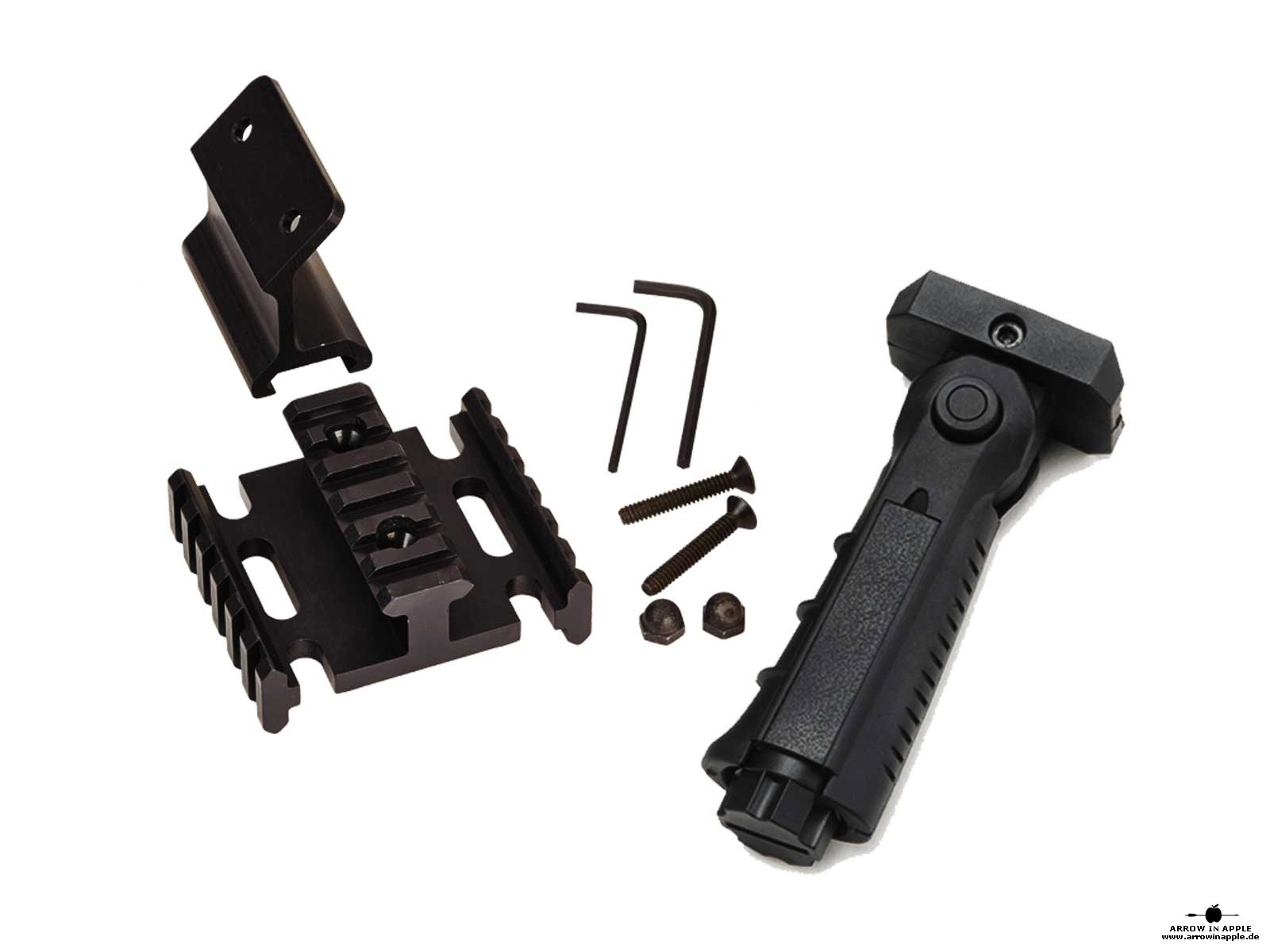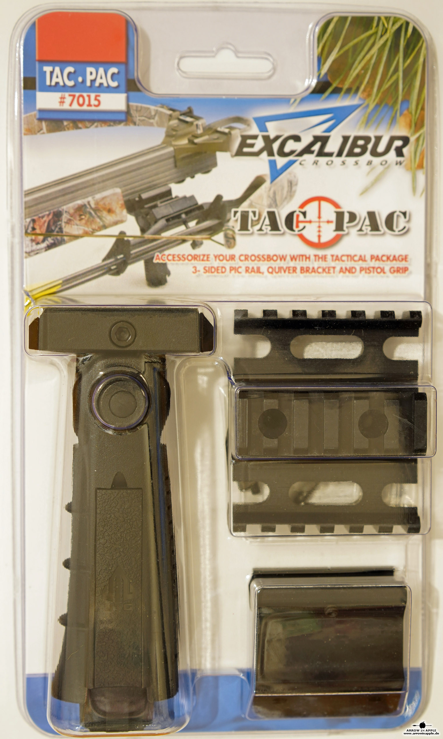 Das Excalibur Tac Pac besteht aus: Taktischer (verstellbarer) Griff, Tac Brack (3 fache Weaverschiene für Zubehör - Installation und Adapter für Köcheranbau