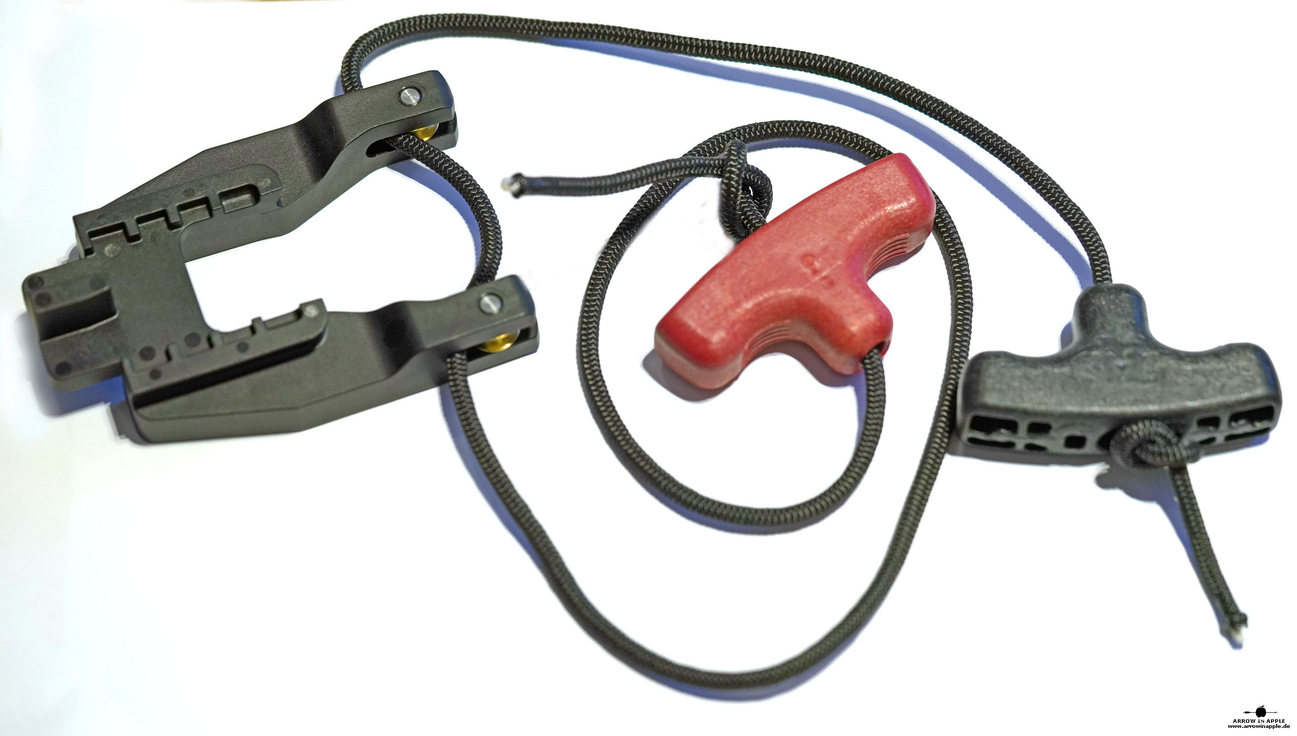 Die Deathstalker Spannhilfe wird wegen der besonderen Bauart des Risers auch in der Pfeilführungsschiene durch eine Art Kielschwert wie beim Segelboot geführt. Als Rope cocker funktioniert das durch umlegen der Spannschnur mit 50% Zugerleicherung.