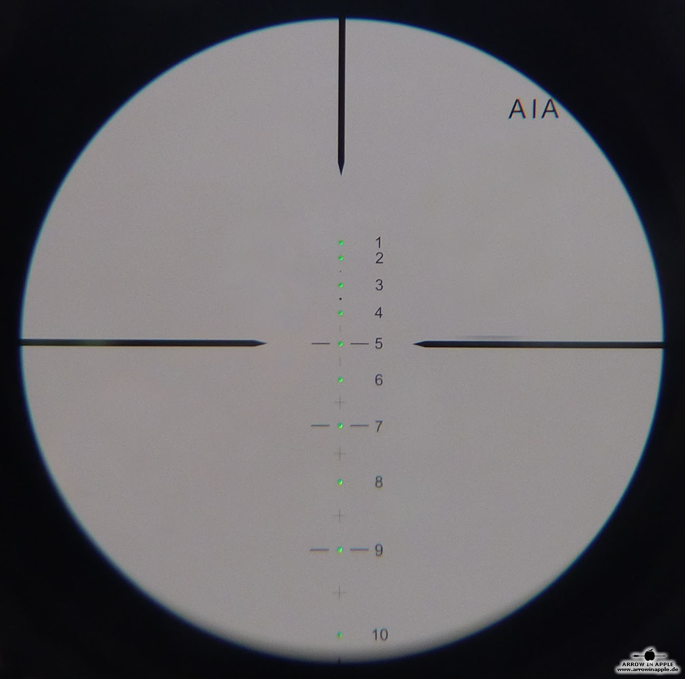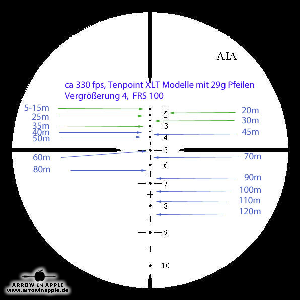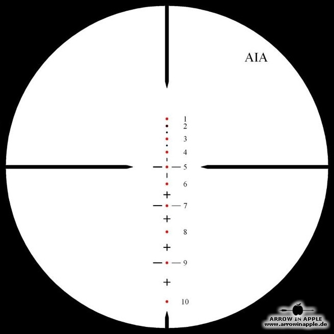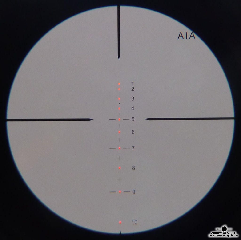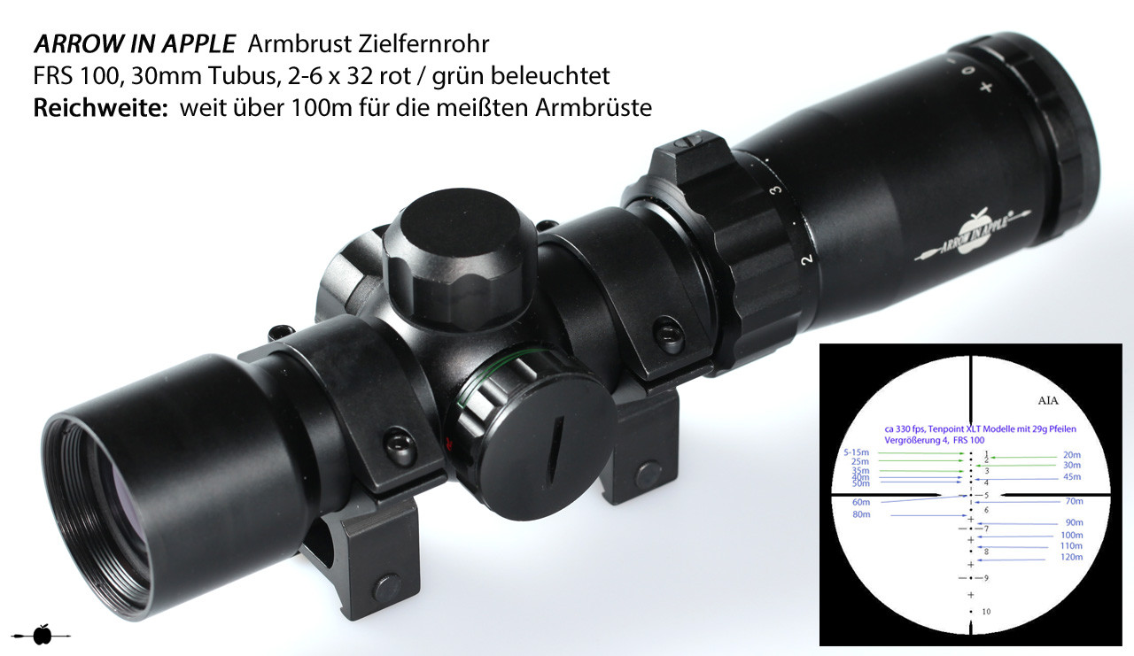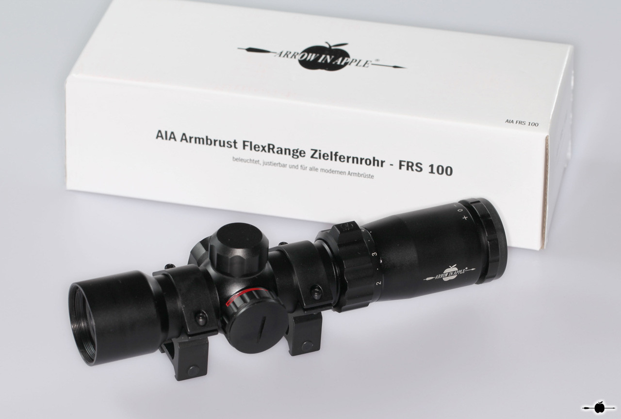 Das FlexRange Zielfernrohr FRS100 ( jetzt als Nachfolger, das FRS 100 tactical ) ist ein Weitschuss - und 3D Armbrustzielfernrohr in einem und somit eine Premiere. So etwas gab es bisher auf dem gesamten Armbrustmarkt noch nicht. Mit den einzigartigen Armbrustzielfernrohren der FRS Serie sind jetzt Optiken auf dem Markt, die den höchsten Ansprüchen von 3D- als auch Targetschützen gerecht werden! In dem FRS 100 haben wir unsere Erfahrung in einem universalen Armbrustzielfernrohr umgesetzt! Es handelt sich um ein 2-6 x 32 mit einem 30mm Rohrdurchmesser und nicht wie sonst üblich 25,4mm. Das Absehen ist hier ins Glas geätzt worden. Der Unterschied zum FRS101 ist das geringere Gewicht (466g) und das Absehen, das im Grundprinzip das Gleiche ist, aber beim FRS 100 sind einzig die 10 Hauptpunkte beleuchtbar. Die zusätzlichen Punkte und Hilfslinien bzw. Kreuze sind extra etwas schwächer gehalten, damit sich der Schütze z.B. bei der Jagd oder im 3D Sport schnell auf das Wesentliche konzentrieren kann. Wegen der Durchnummerierung und Beleuchtung der Entfernungspunkte ist immer eine schnelle Orientierung möglich. Das Zielfernrohr FRS 100 hat nicht nur fast die 3 fache Reichweite handelsüblicher Armbrust Zielfernrohre, sondern viel wichtiger, eine feinere Einstellung - übliche Armbrust Zielfernrohre (1 Klick = 1 " (2,54 cm) auf 20 Yards/ ca. 18m) AIA FRS 100/ 101 (1 Klick = 1/2 " (1,257cm) auf 100 Yards / ca. 91m). Dadurch ist eine exaktere Justierung möglich. Einmal eingestellt bzw. eingeschossen, braucht gegenüber einem HHA Optimizer (Weitschussaufsatz), welcher bei jeder Entfernung neu verstellt werden muss, beim FRS 100 auf allen Distanzen nichts mehr verstellt werden. Das FRS hat aufgrund seiner Bauform ein sehr großes Sichtfeld. Der große Blickwinkel und das einzigartige Absehen ermöglichen es auf sonst nicht erreichbare Weiten anzuhalten. So ist es auch möglich mit nicht so starken Armbrüsten Ziele von 10m bis weit mehr als 100m ins Visier zu nehmen und sicher zu treffen. All das, ohne eine Umstellung am Zielfernrohr vornehmen zu müssen! Die Anhaltepunkte im Absehen von 1-6 entsprechen einer ballistischen Pfeilflugkurve, so dass man mit der Vergrößerungsverstellung die optimale Einstellung für seine Armbrust herausfinden kann. Dadurch passen dann die Zahlen 1-6 genau auf die Entfernungen in 10m Schritten. Das bedeutet 1 = 10m, 2 = 20m usw. bis…6 = 60m. Dadurch kann es hervorragend für den 3 D Sport benutzt werden. Man kann aber auch seine Wunschvergrößerung einstellen und das Zielfernrohr danach einschießen. Das spezielle Absehen ermöglicht dieses. Der sehr lichtdurchlässige 30mm Tubus gepaart mit der hochwertigen Optik ermöglichen beste Resultate beim 3D-Sport und Targetschiessen auf größte Entfernungen. Das rot/grün beleuchtete Absehen ist bei schwierigen Lichtverhältnissen eine echte Hilfe. Die Intensität der Beleuchtung ist so abgestuft, dass man bei der Zielsuche unterstützt und nicht geblendet wird! Das AIA FRS 100 macht seinem Namen als Flex-Range-Scope alle Ehre. Bei einer TenPoint Carbon Elite XLT mußten wir vorerst bei 120m wegen des schlechten Wetters den Test abbrechen, demnächst dazu mehr. Das ZF gibt aber mindestens 170m mit Vergrößerung 4 her. Auch bei leistungsschwächeren Armbrüsten benötigt man keinen zusätzlichen Weitschußaufsatz mehr. Werten Sie Ihre Armbrust jetzt mit diesem Zielfernrohr auf. Lieferung inkl. der 30mm Montageringe